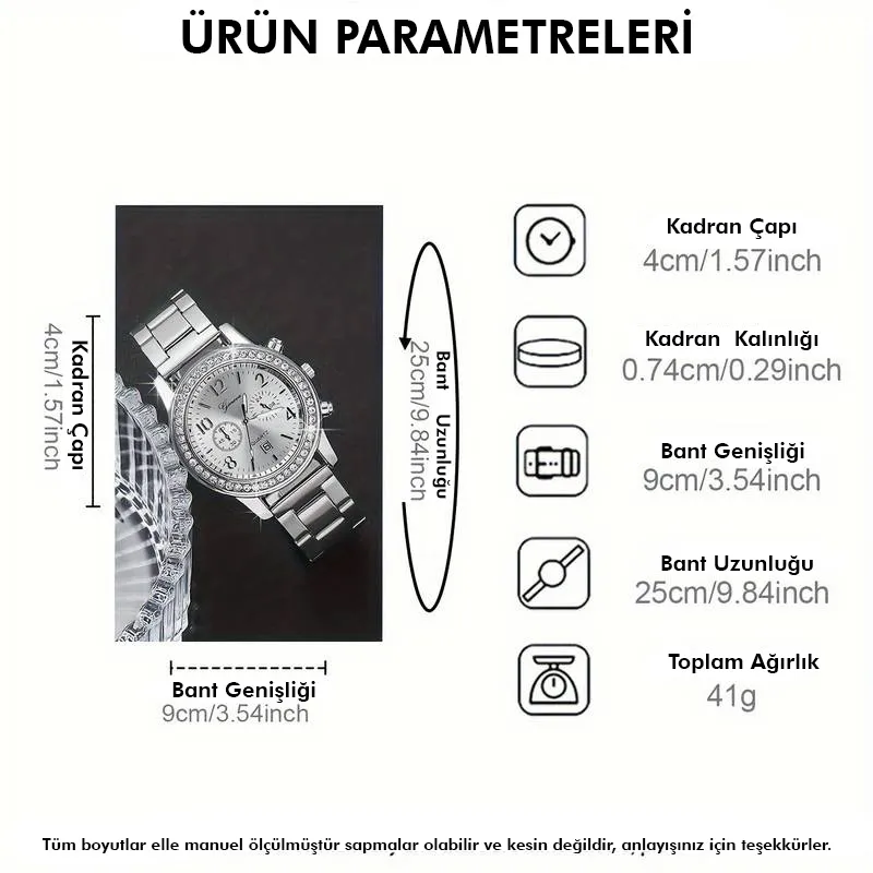 Gümüş renk tonlarında tasarlanmış bu şık taşlı kuvars saat ve 7 adet bilezikten oluşan set, zarafetin ve modanın mükemmel birleşimi. Saatin çinko alaşım kayışı, işaretçisi ve kasası dayanıklılık sağlarken, her biri özenle tasarlanmış bilezikler tarzınıza benzersiz bir hava katıyor.